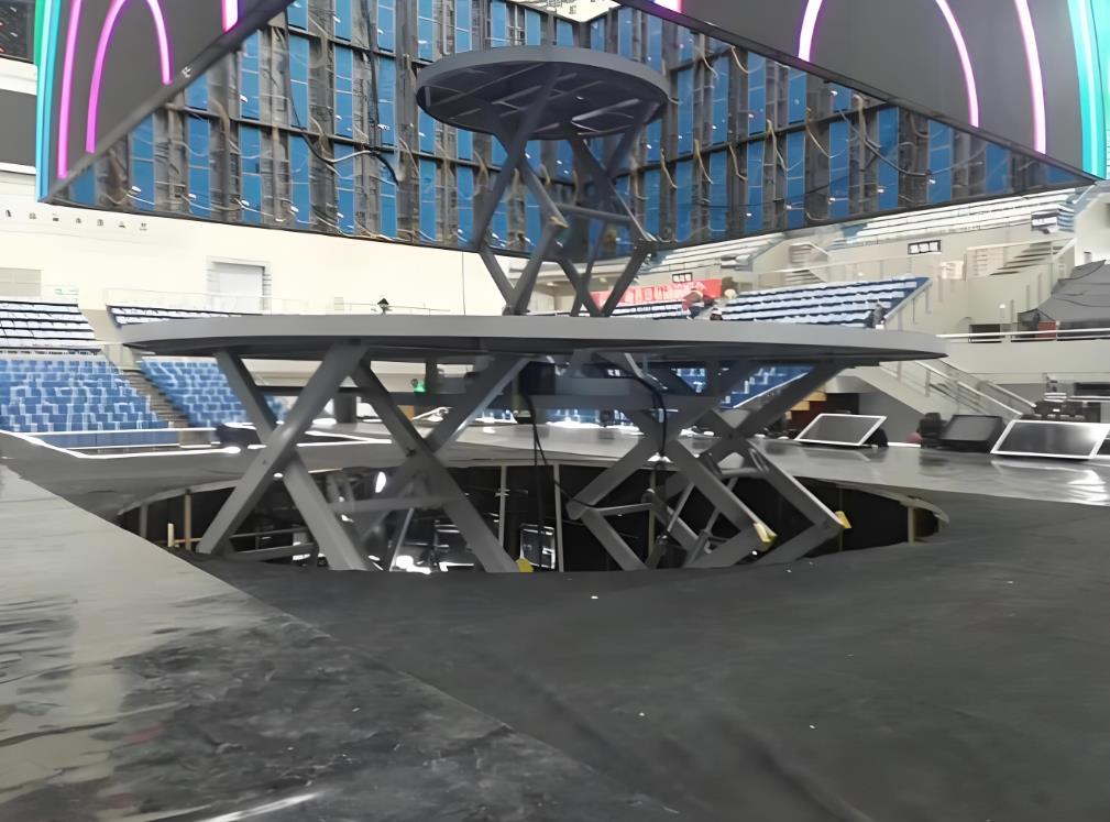 液压升降舞台也叫舞台升降机专门安装在舞台上,用于舞台升降及旋转叫舞台升降机。有升降、旋转、倾斜等多种功能,控制采用自锁、互锁、行程开关、机械限位、液压防爆等保护措施。